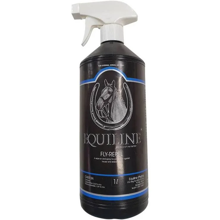Equiline Fly Spray 1L. A wipe-on and Spray for protection against house and stable flies. CONTENTS: Cypermethrin 0.25% m/v, Piperonyl butoxide 1.25% m/v