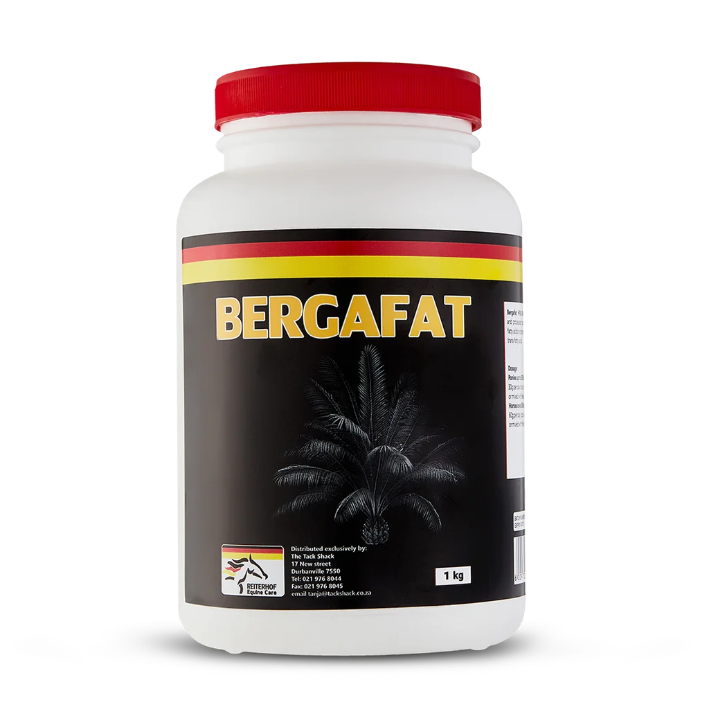 Reiterhof Bergafat is a premium powdered supplement derived from processed palm oil, offering a rich source of essential fatty acids and phospholipids while being completely free of trans-fatty acids. Specially formulated to support your horse's coat health, it promotes a glossy, shiny coat while adding vital condition to their overall physique. This supplement is perfect for maintaining a healthy weight, improving skin condition, and providing energy.