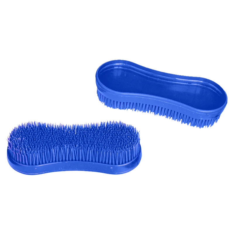 Show Time stiff bristle, plastic brush. This curry brush has a contoured shape for easy grip. Durable plastic material. Great for shedding coats and cleaning heavy dirt; works on manes and tails, and makes a great brush cleaner too.